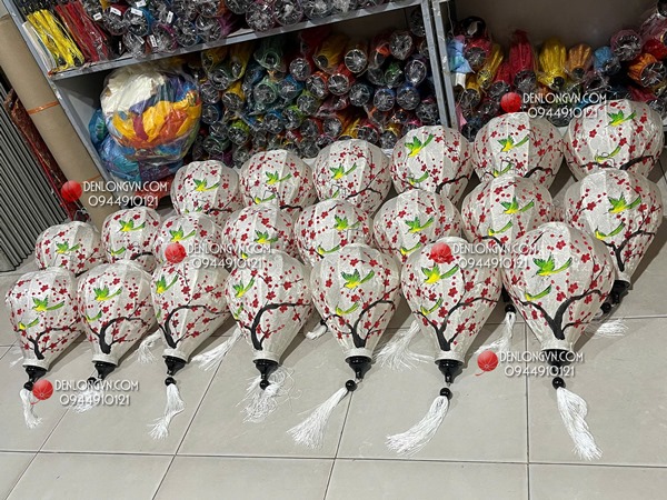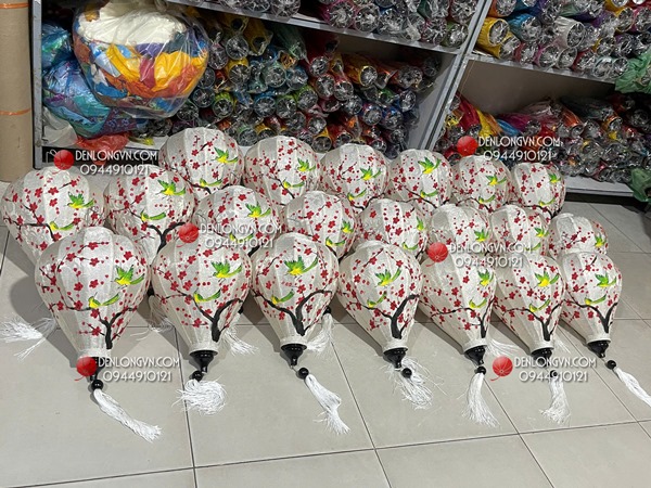 Đèn lồng lụa trắng vẽ hoa đào cực kỳ xinh xắn, vừa trang trí làm góc checkin chụp ảnh, vừa trang trí góc không gian hàng quán, có thể treo thành hàng hoặc thành rèm đèn lồng, so le xen kẽ rất đẹp, với sự kết hợp giữa đèn lồng hội an và nét vẽ hoa phong cảnh của họa sĩ trên nền vải lụa tơ tằm truyền thống.