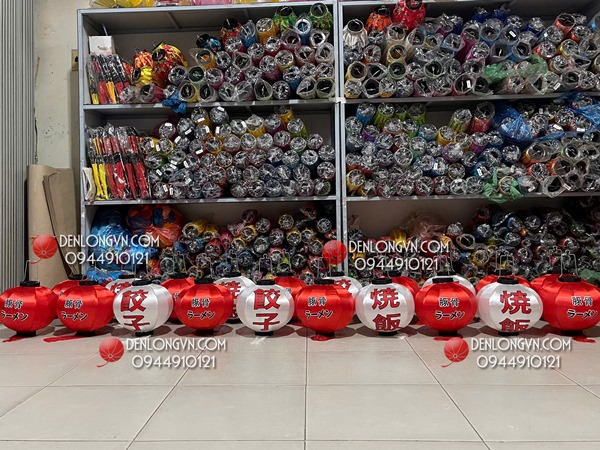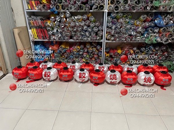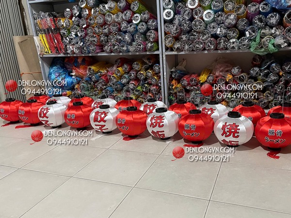 Đèn lồng tròn kiểu Nhật trang trí nhà hàng, đây là sự kết hợp giữa đèn lồng tròn Hội an có thể xếp gọn lại khi vận chuyển, được in các chữ tiếng Nhật trong ẩm thực và tên gọi theo yêu cầu của khách hàng, với màu sắc đa dạng hoặc chỉ gam màu đỏ trắng truyền thống kiểu Nhật, được dùng trang trí nhiều trong các nhà hàng Sushi, ẩm thực kiểu Nhật, Hongkong, Hàn…